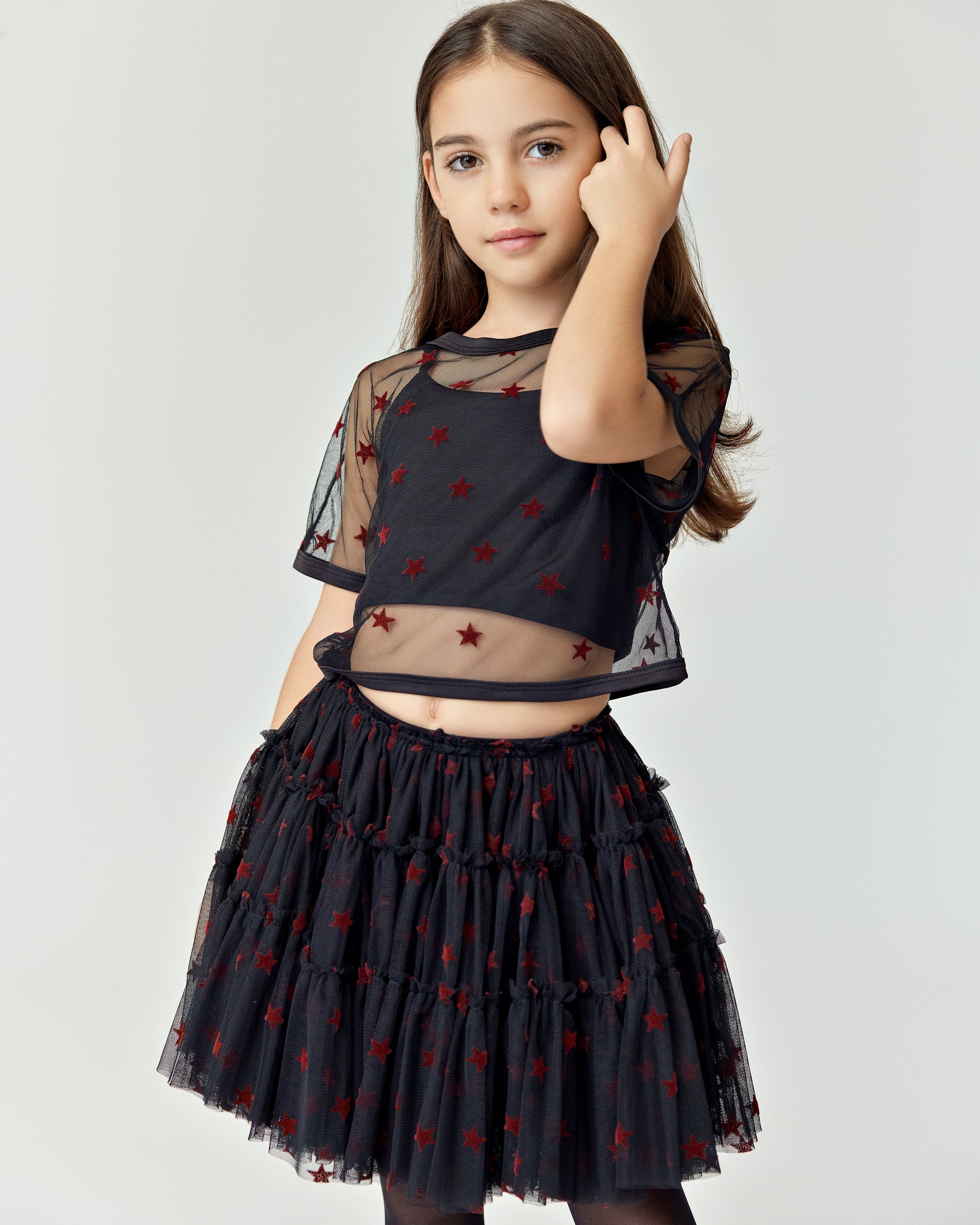"Starry Tulle" is an elegant black set featuring a delicate tulle skirt and matching top adorned with velvet star accents. Perfect for a festive night out or a magical evening event.