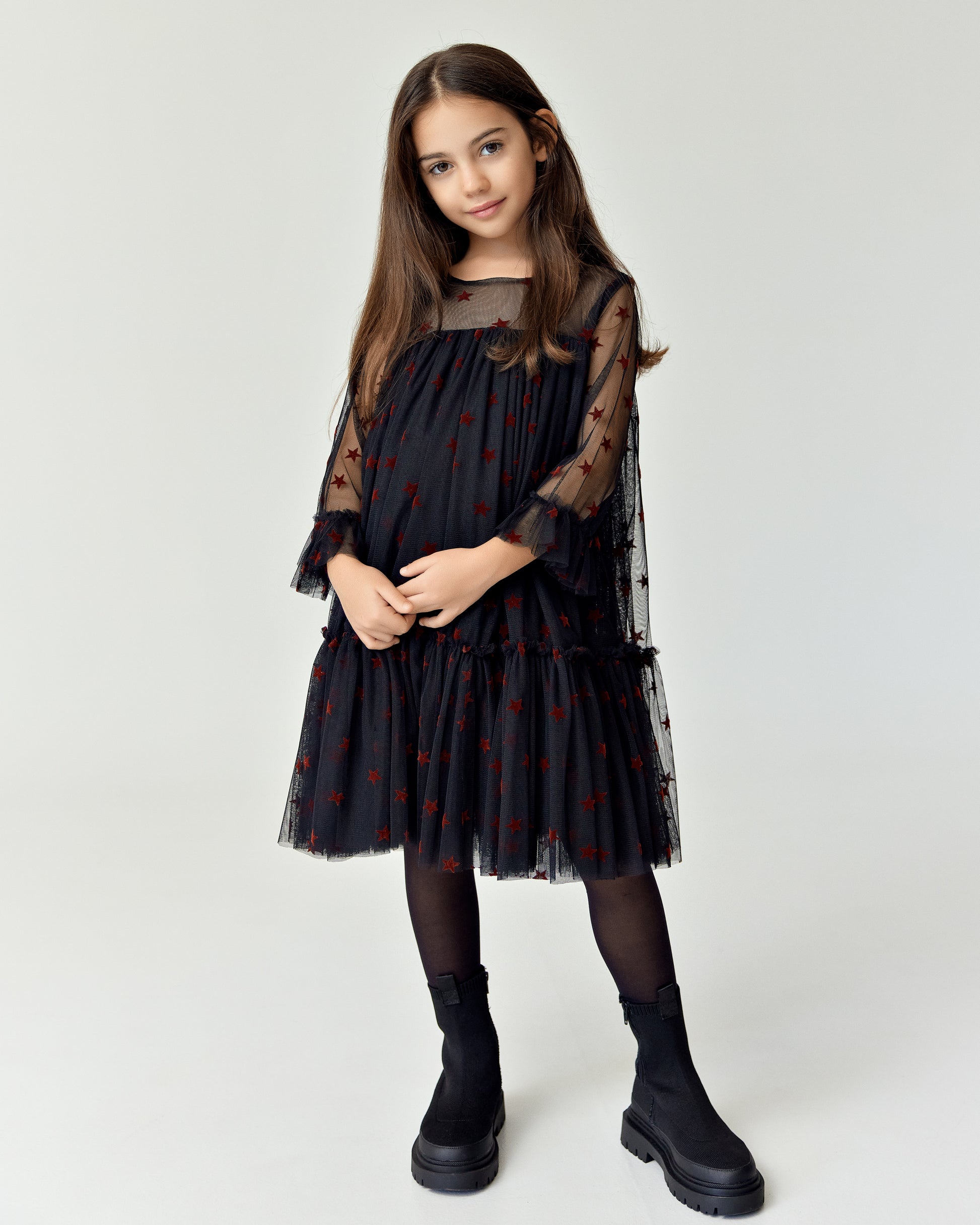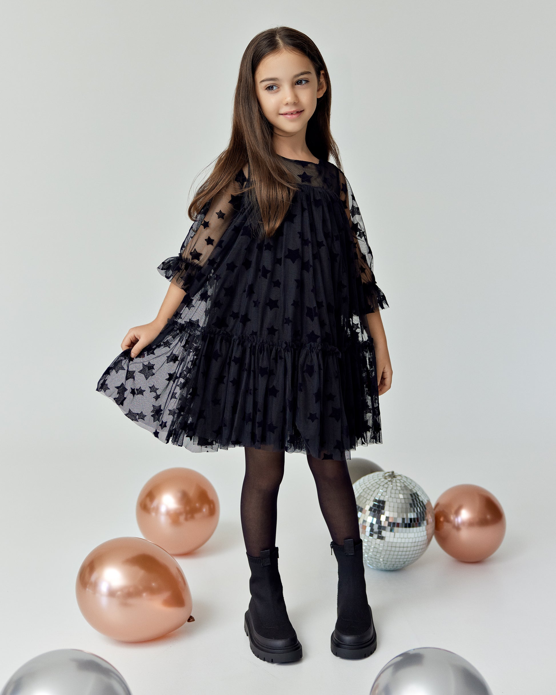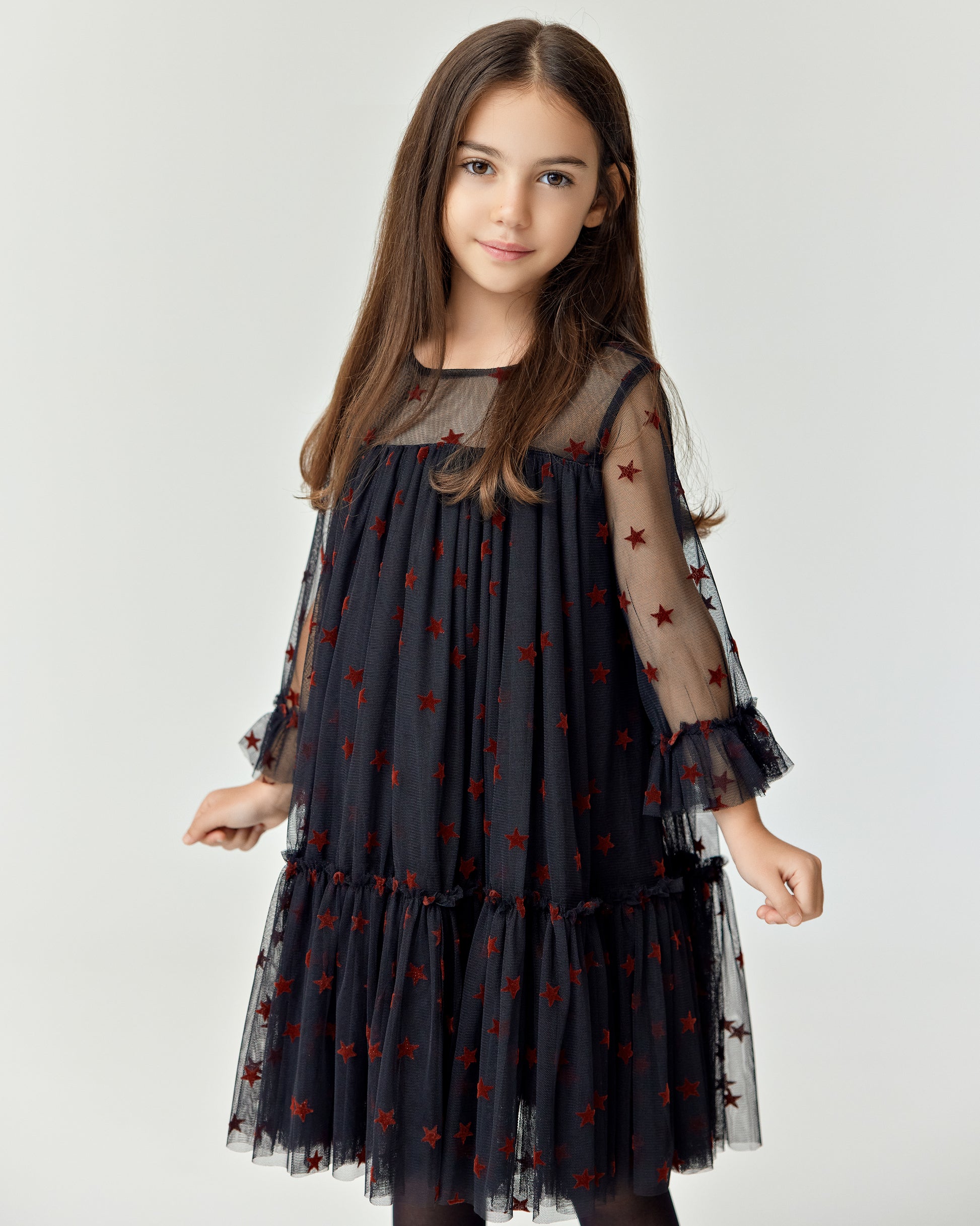 Starlit Dream" is a magical tulle dress adorned with velvet stars, offering a whimsical and elegant look perfect for any special occasion.
