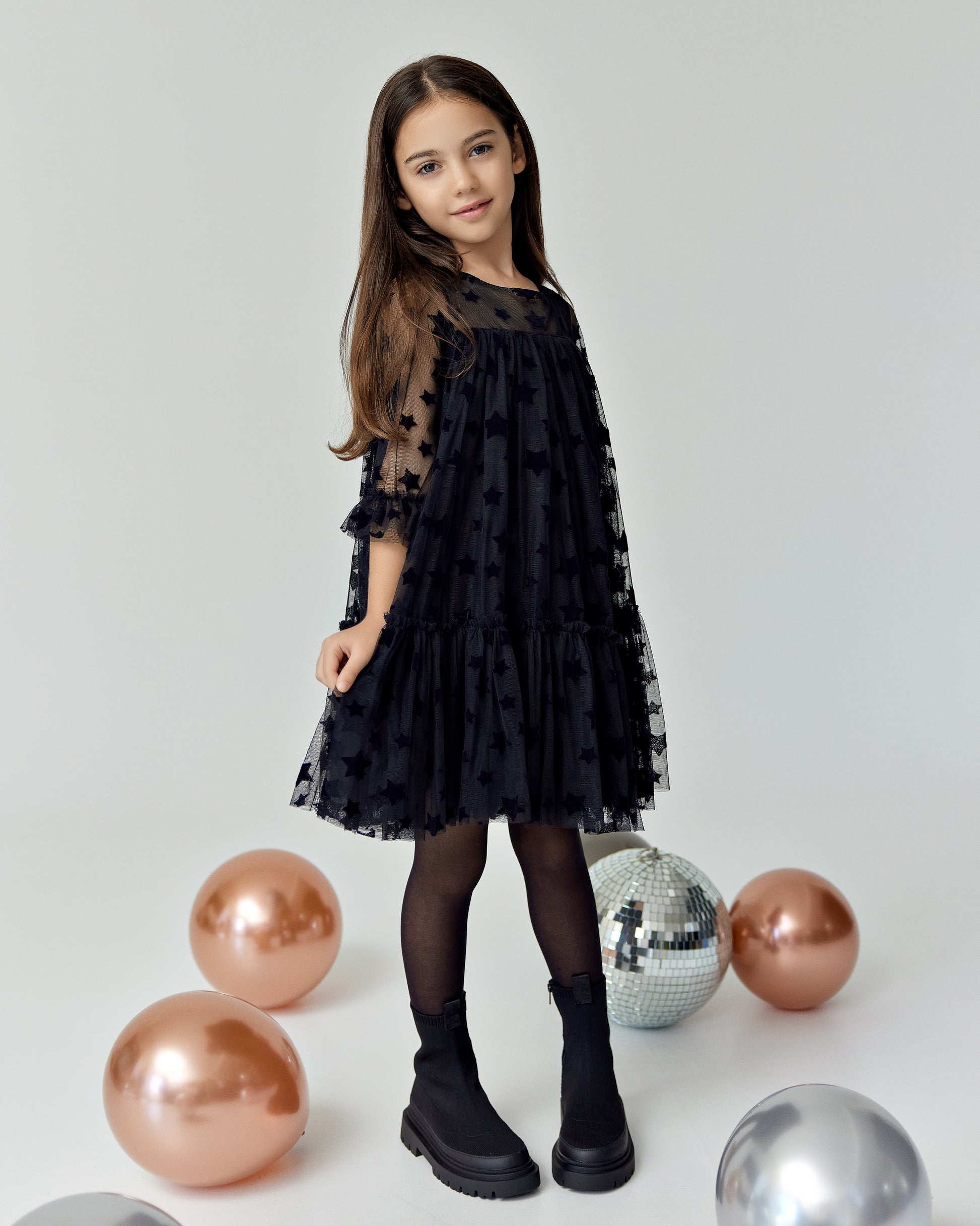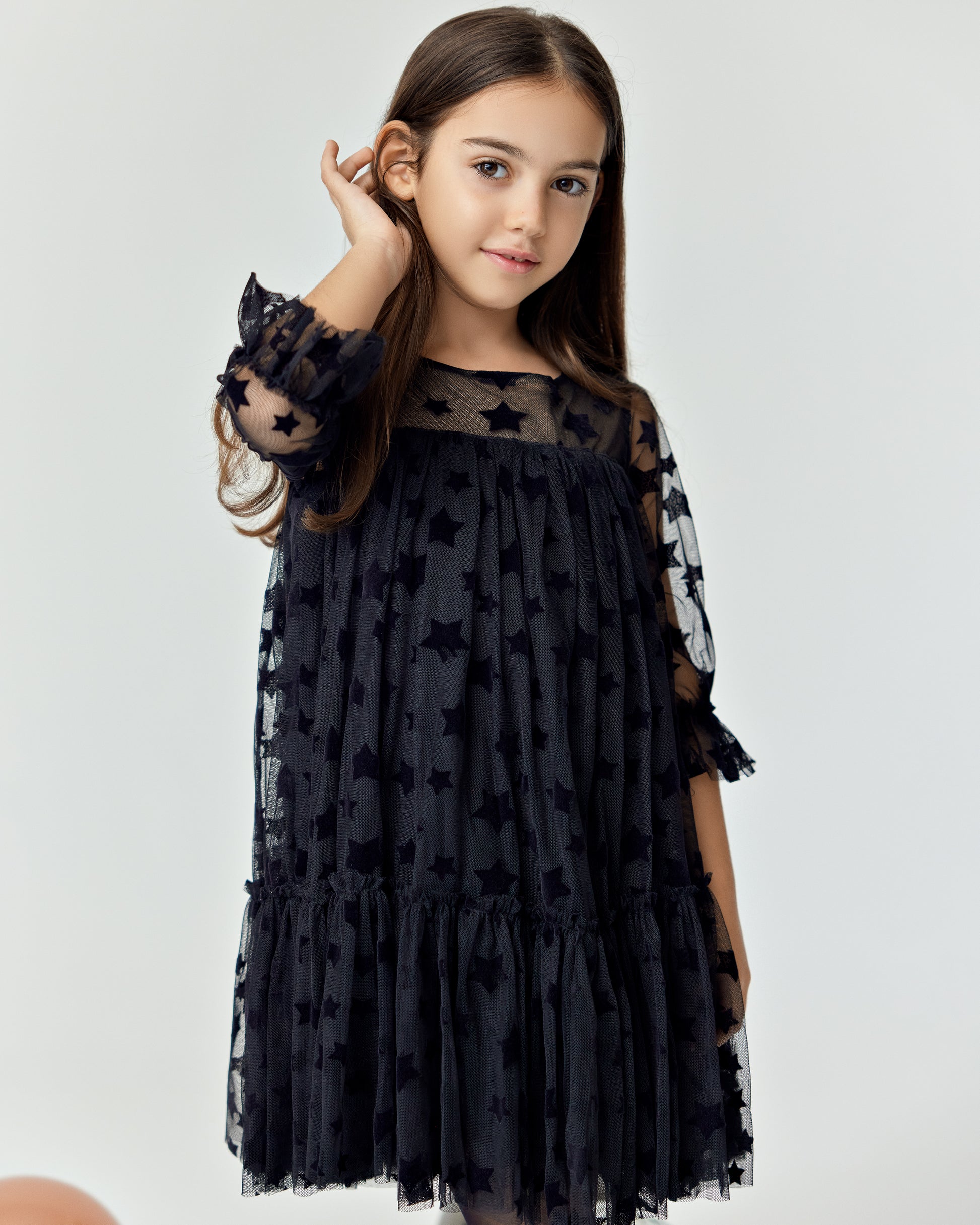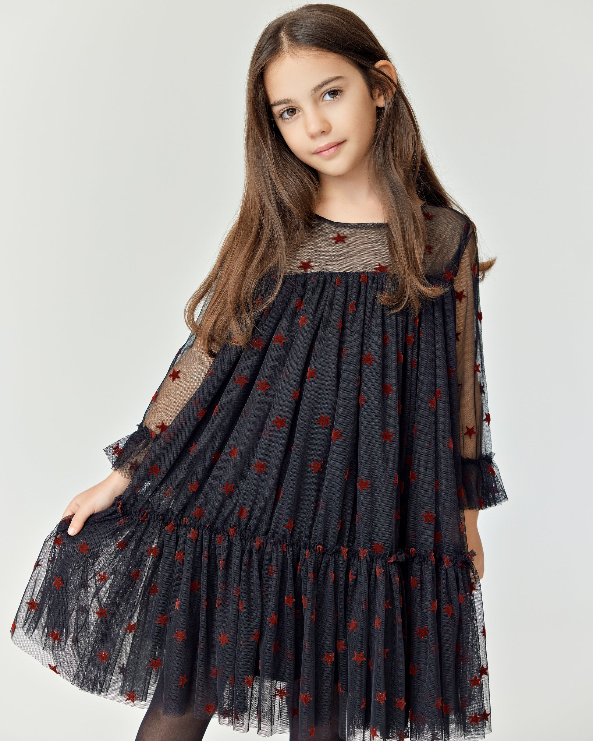 Starlit Dream" is a magical tulle dress adorned with velvet stars, offering a whimsical and elegant look perfect for any special occasion.