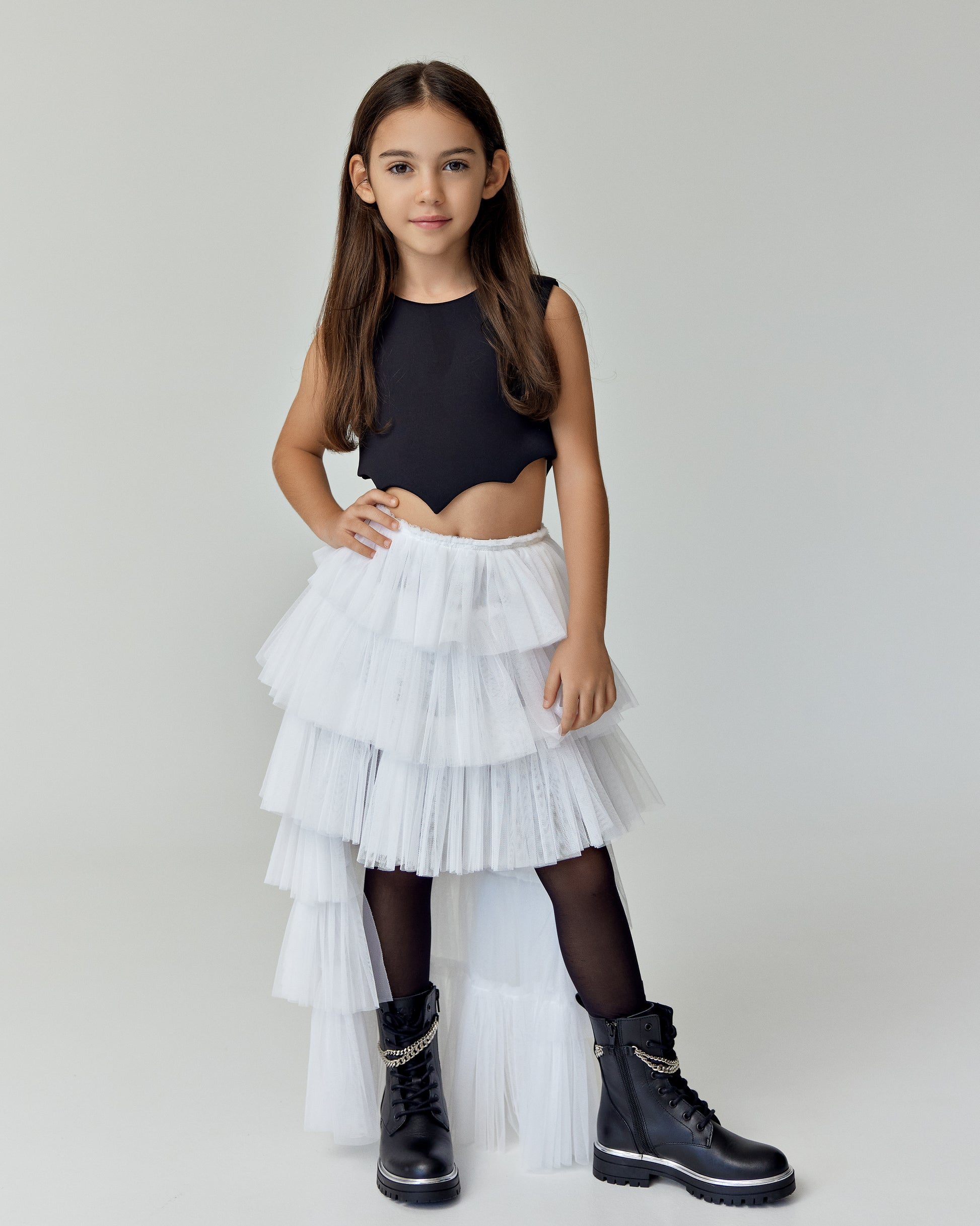 Nightfall Elegance" combines a white asymmetrical tulle skirt with a bold black Batgirl top, creating a striking balance of softness and edge. Perfect for a chic yet daring look.