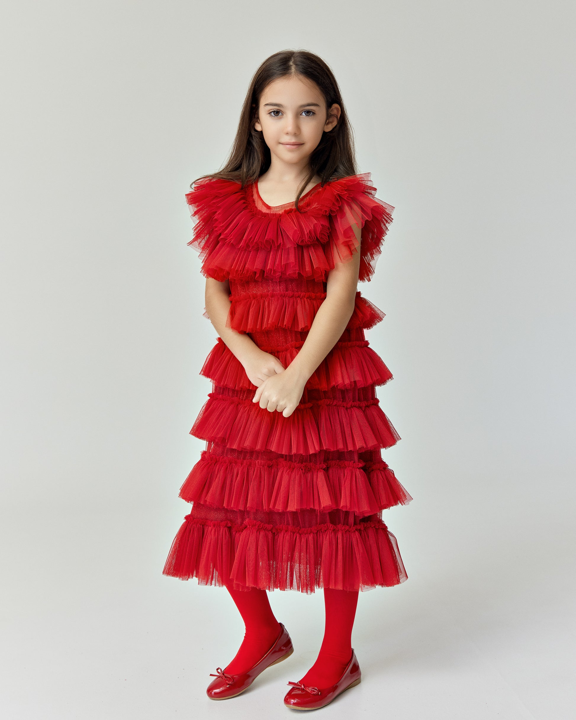 "Ruby Radiance" is a stunning long red dress with ruffles and a shiny, sheer fabric, exuding elegance and a touch of glamour. Perfect for a bold, captivating look.