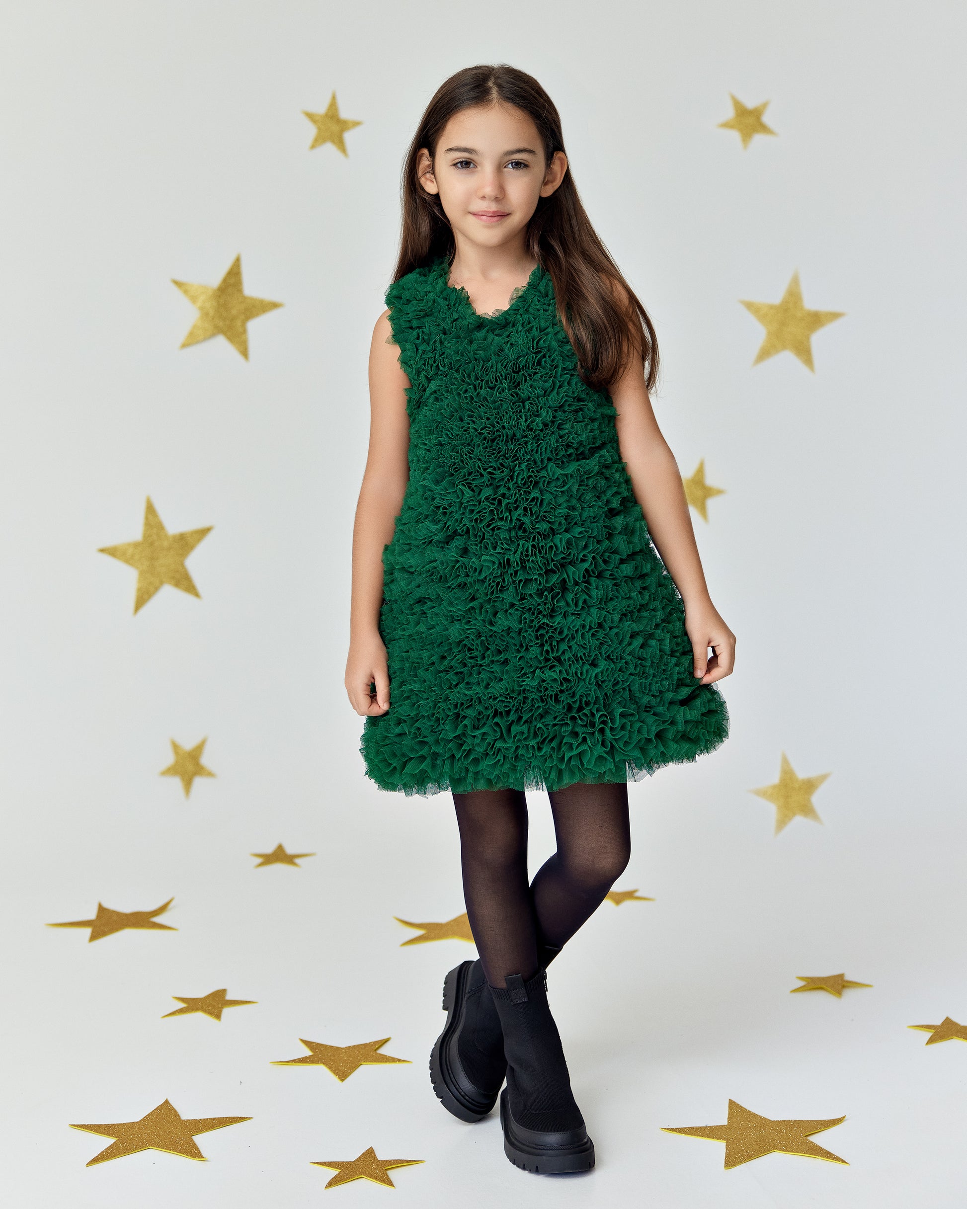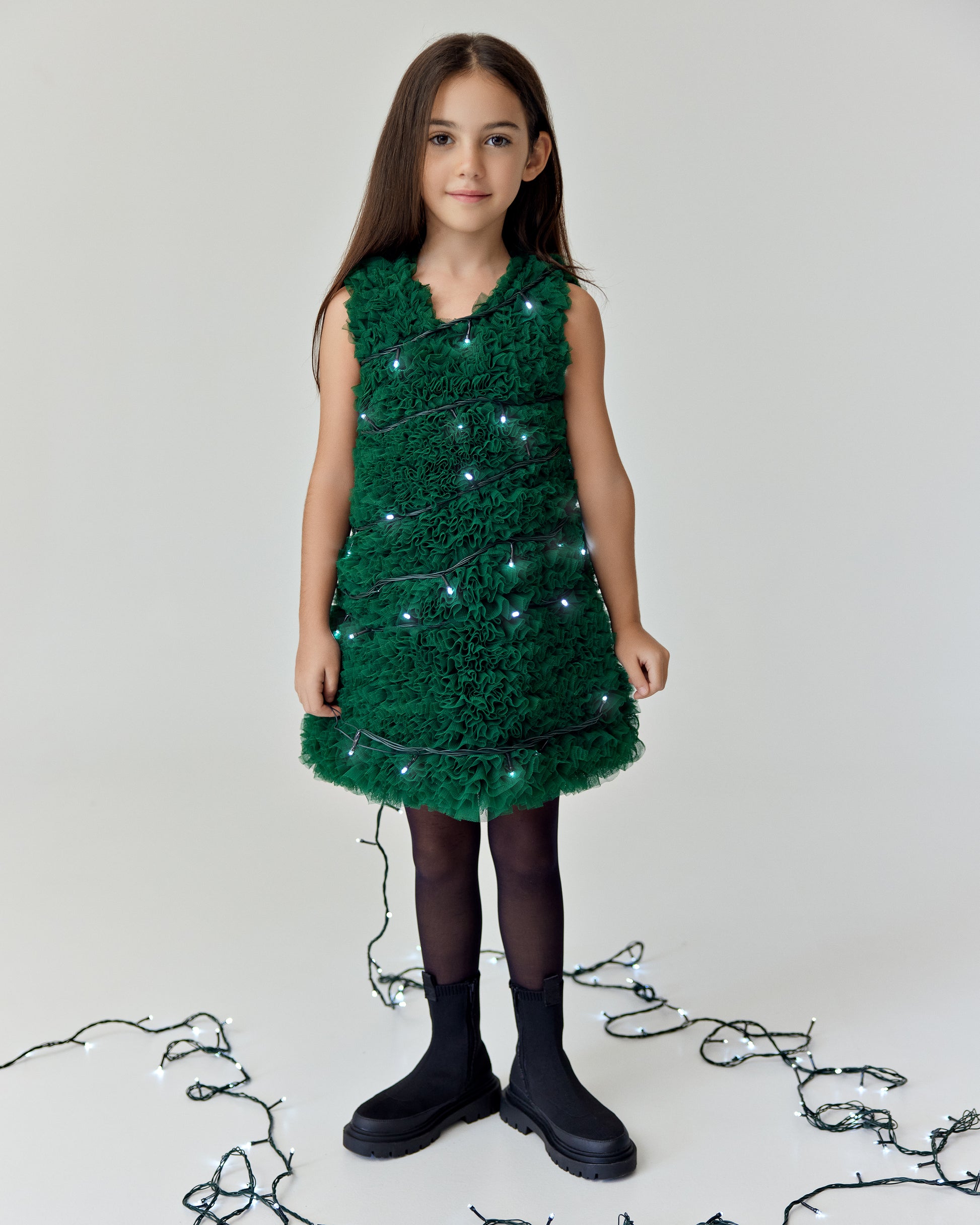 "Christmas Eve" is a whimsical green dress with layered tulle, designed to resemble a beautifully adorned Christmas tree, bringing festive cheer and elegance to the Christmas Eve