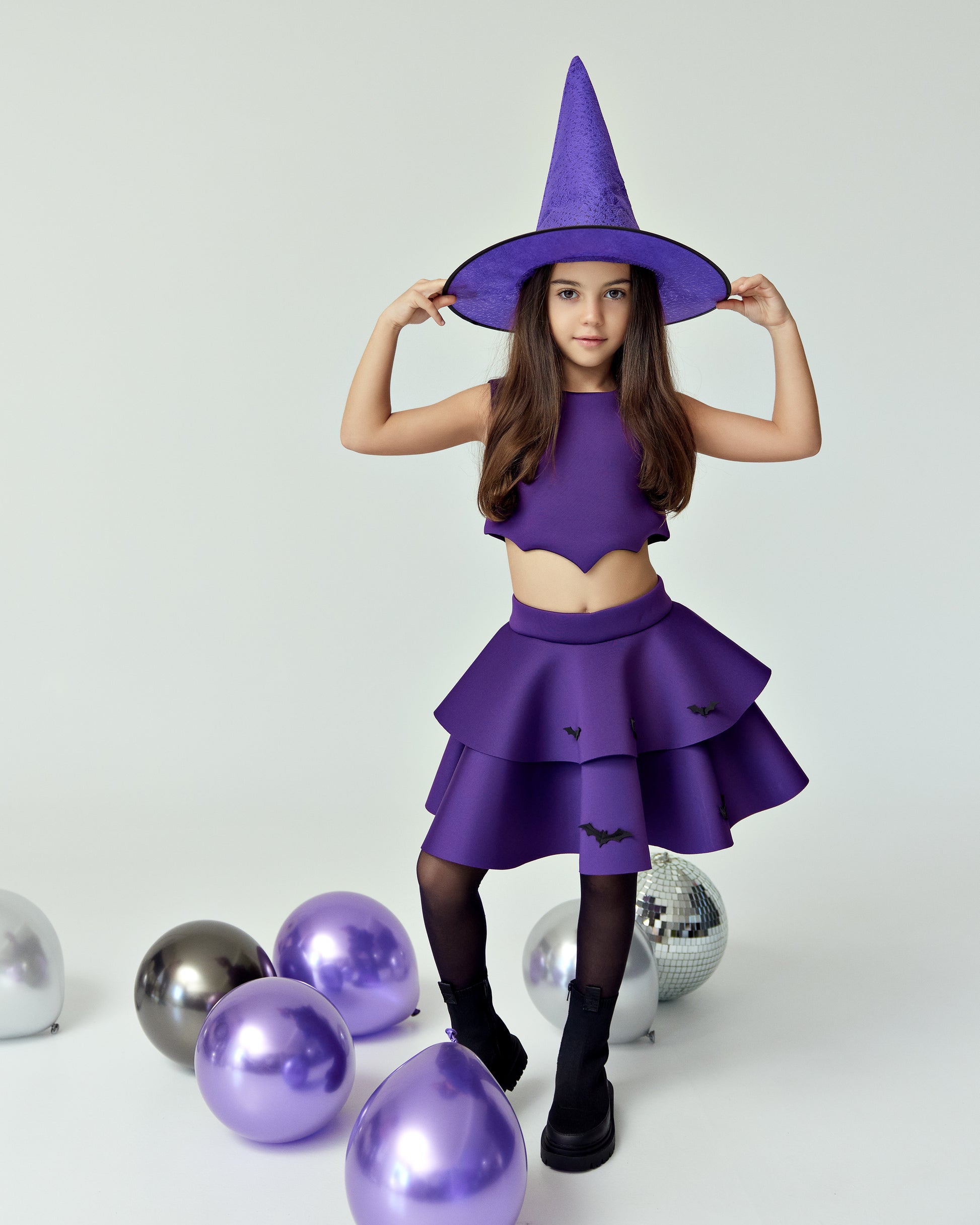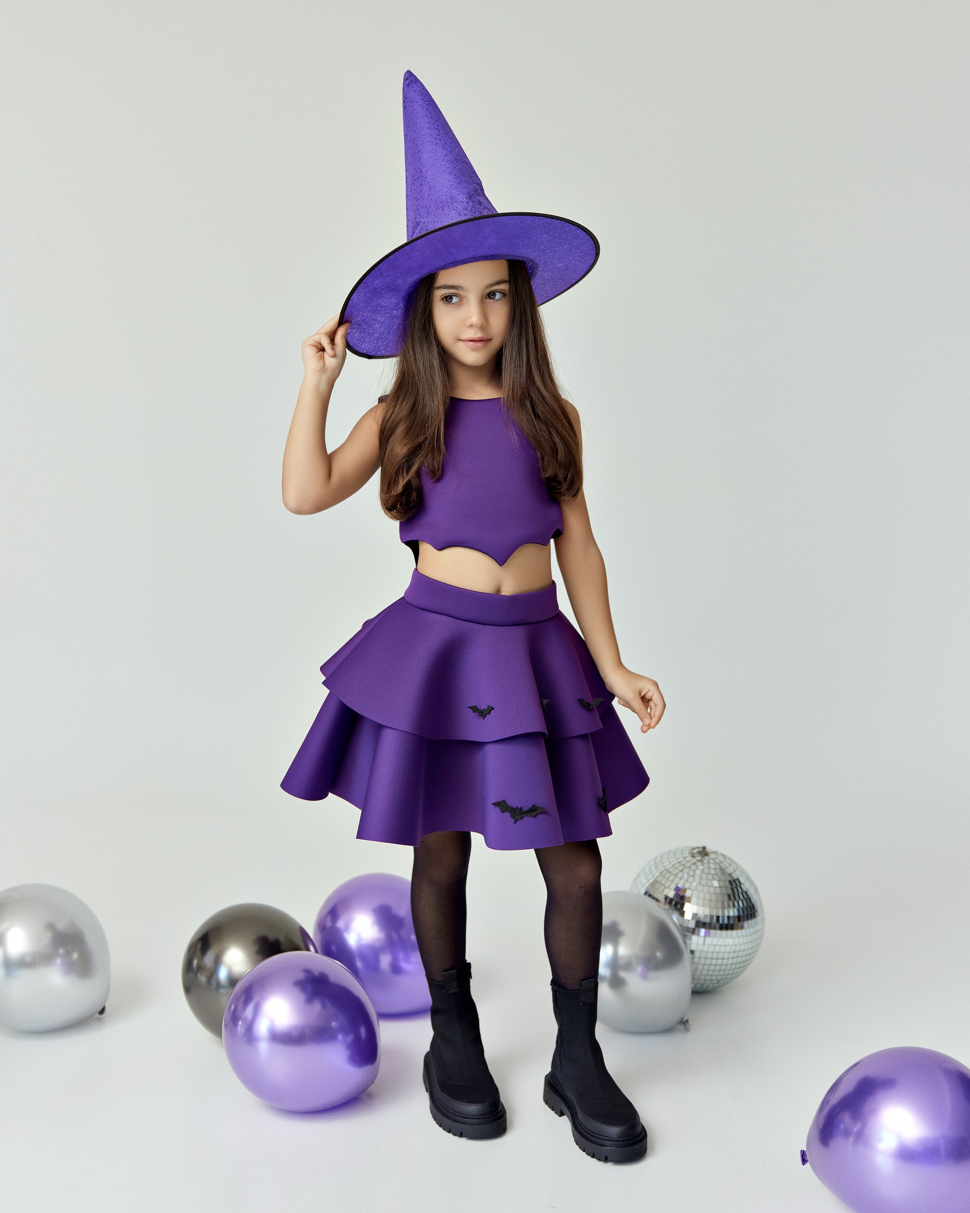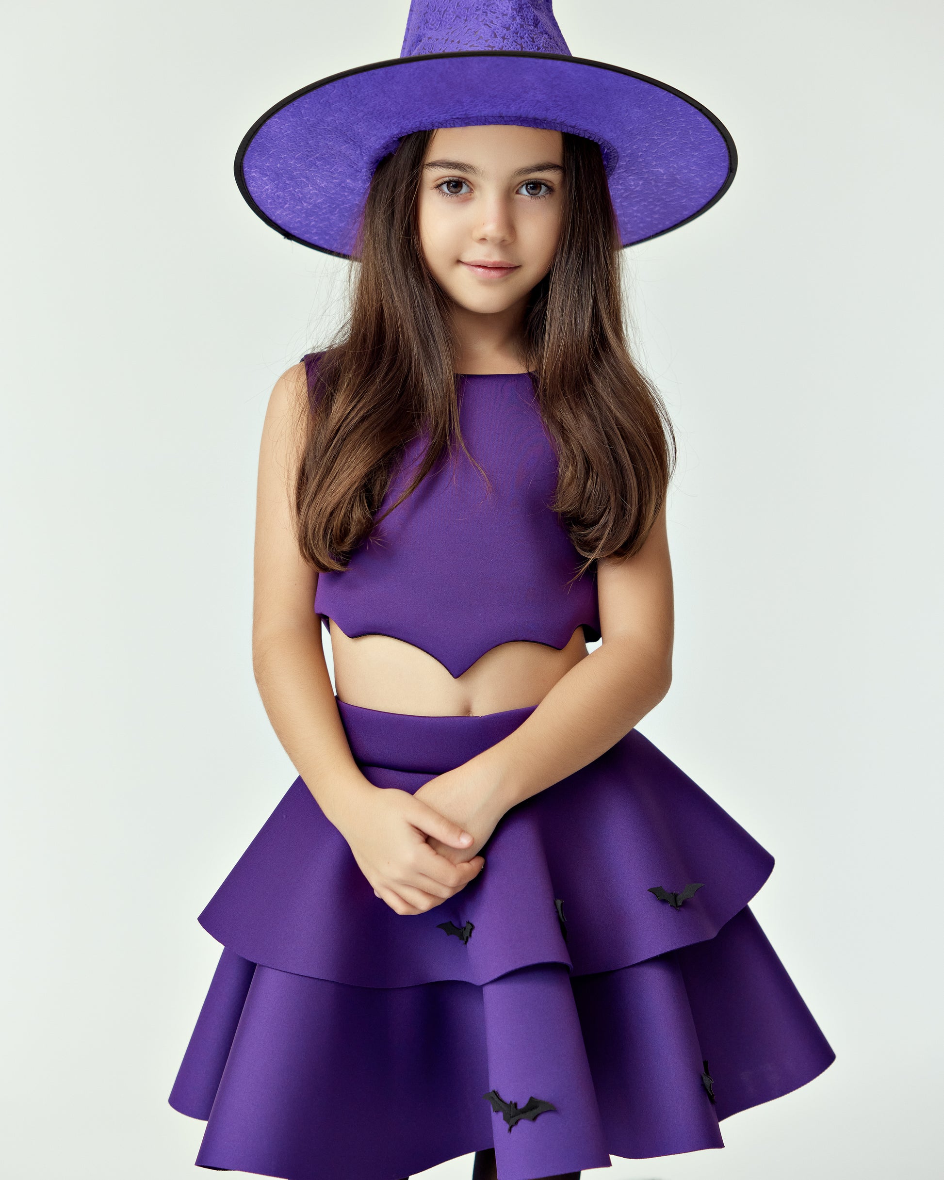 "Midnight Flight" is a purple two-layer scuba skirt with bat details and a matching bat top, perfect for a bold, edgy look.