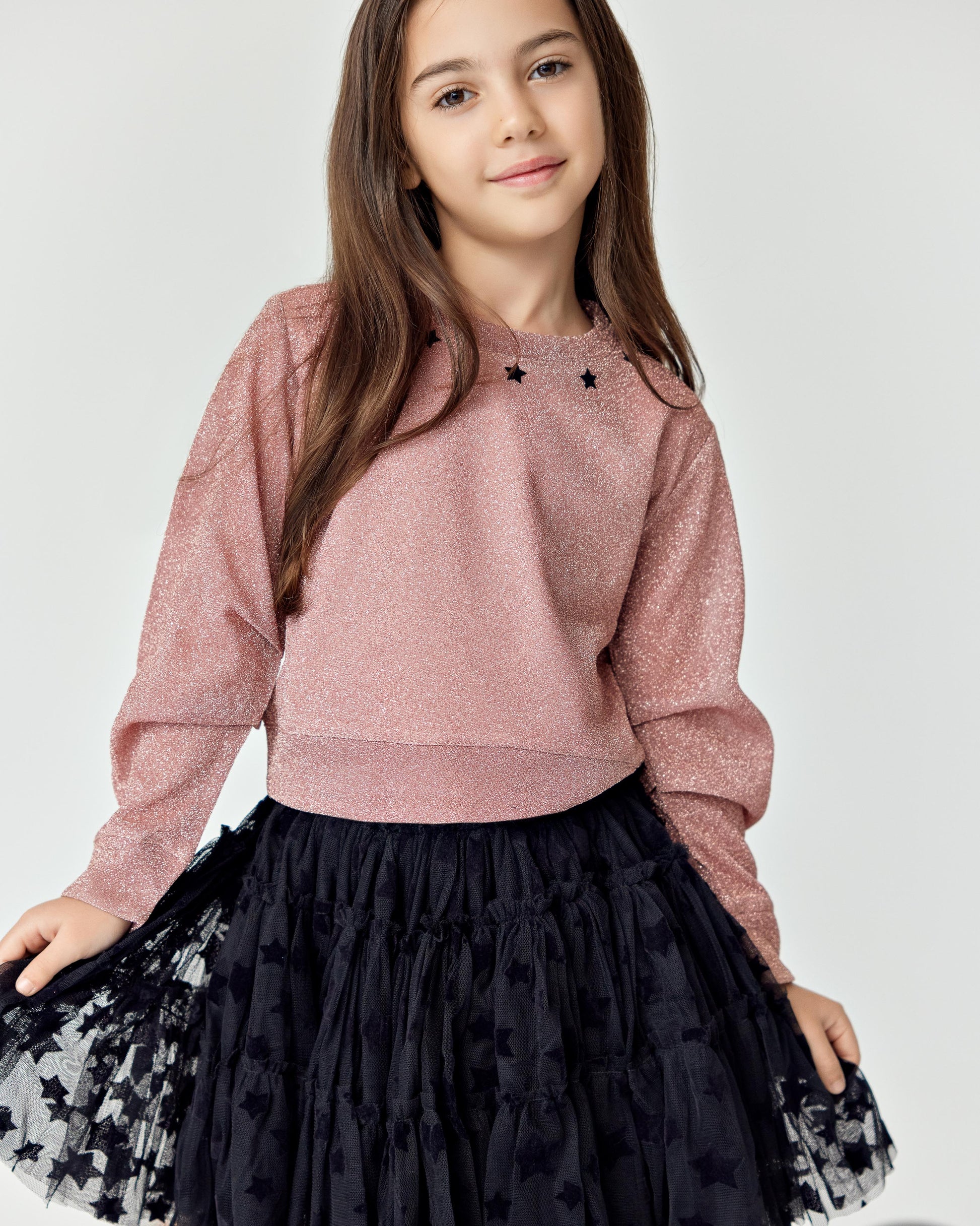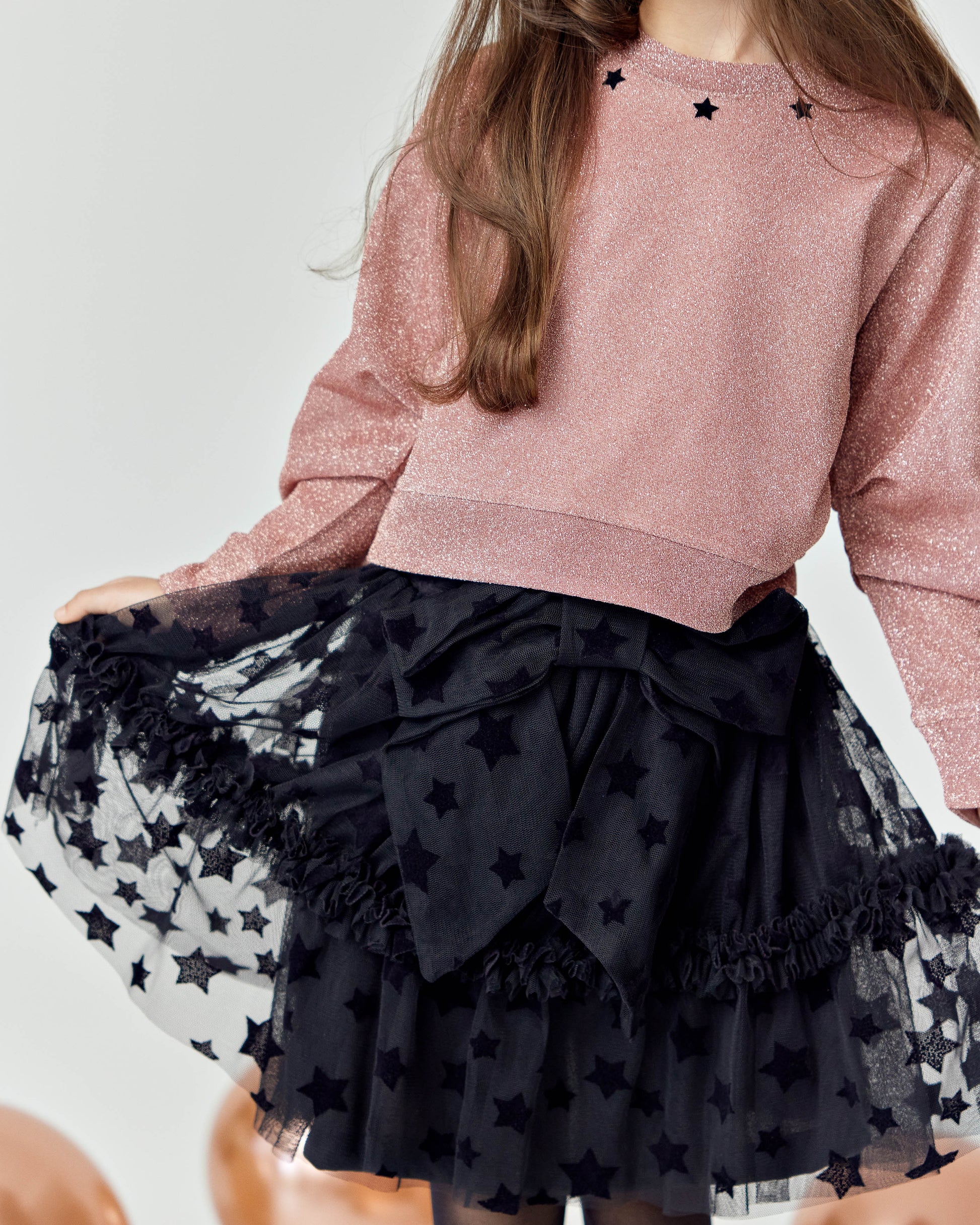 Starlit Blush" features a black tulle skirt with velvet stars and a playful bow, paired with a soft pink sweater, creating a chic and whimsical look.